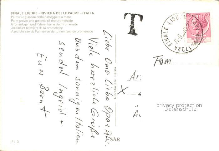 old postcard Finale Ligure Riviera delle Palme Palmizi e giardini della passeggiata a mare Gruenanlagen Palmenhain Promenade postalisch gelaufen Erhaltung siehe scans
