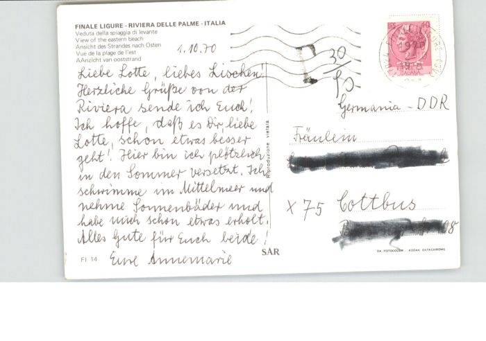 old postcard Finale Ligure Riviera Palme Spiaggia Strand postalisch gelaufen