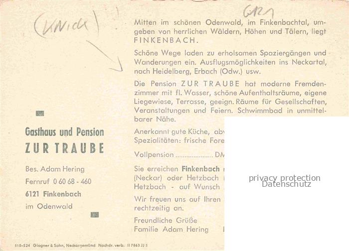74155226 Finkenbach Odenwald Hessen Gasthaus Pension zur Traube postalisch nicht gelaufen Werbekarte (keine Postkarte) Erhaltung siehe scans [FriedD77] KatCode: 11110006437014