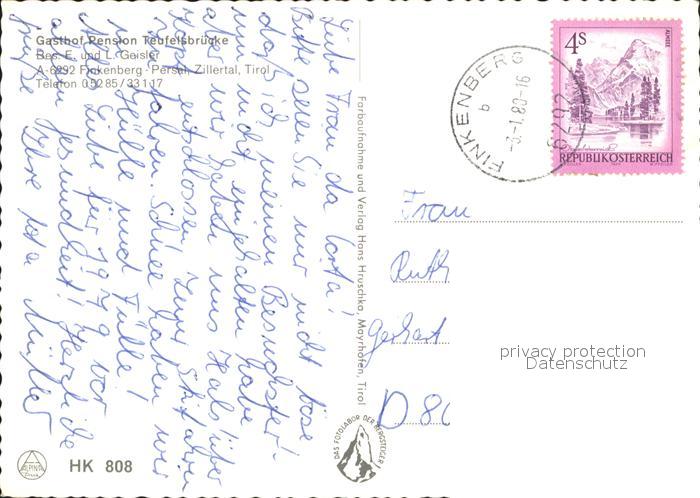 71909198 alte Postkarte Finkenberg Tirol Gasthof Pension Teufelsbruecke postalisch gelaufen Erhaltung siehe scans KatCode: 11390335070908