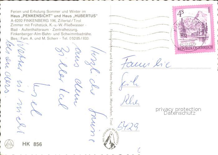 71961216 alte Postkarte Finkenberg Tirol Haus Penkensicht Haus Hubertus postalisch gelaufen Erhaltung siehe scans KatCode: 11390335070908