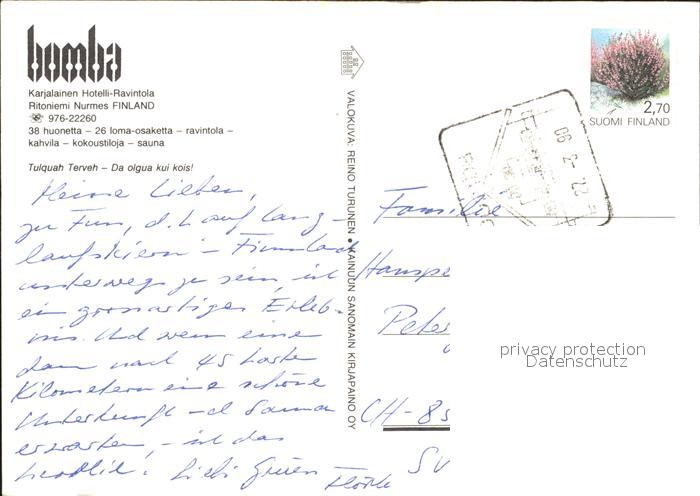old postcard Finnland Suomi Bomba Karjalainen Hotelli Ravintola Rioniemi Nurmes postalisch gelaufen Erhaltung siehe scans