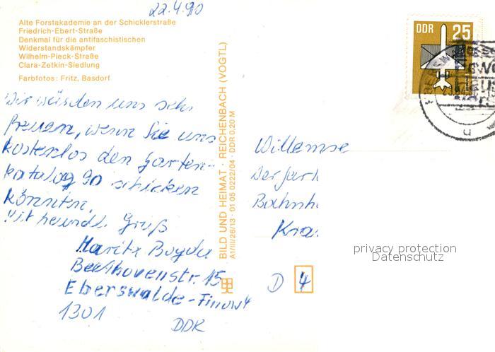 72928660 alte Postkarte Finow Eberswalde Alte Forstakademie Denkmal Wilh Pieck Strasse Clara Zetkin Siedlung postalisch gelaufen Erhaltung siehe scans [WerneD78] KatCode: 11110012060052