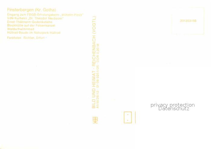 72697447 Finsterbergen FDGB Erholungsheim Wilhelm Pieck VdN Kurheim Dr Theo Neubauer Thaelmann Gedenkstaette Blockhuette Felsenkanzel Waldschwimmbad Huellrod Baude postalisch nicht gelaufen Erhaltung siehe scans [WerneD78] KatCode: 11110016067017