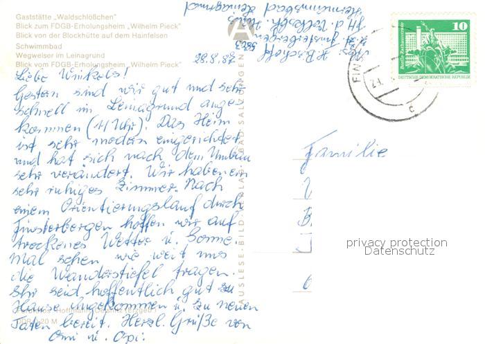 73062317 alte Postkarte Finsterbergen Gaststaette Waldschloesschen FDGB Erholungsheim Wilhelm Pieck Blockhuette Hainfelsen Schwimmbad Wegweiser Leinagrund postalisch gelaufen Erhaltung siehe scans [FriedD77] KatCode: 11110016067017