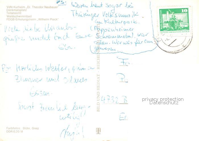 73081974 alte Postkarte Finsterbergen VdN Kurheim Neubauer Denkmalsplatz Waldschwimmbad FDGB Erholungsheim Wilhelm Pieck postalisch gelaufen Erhaltung siehe scans [FriedD77] KatCode: 11110016067017