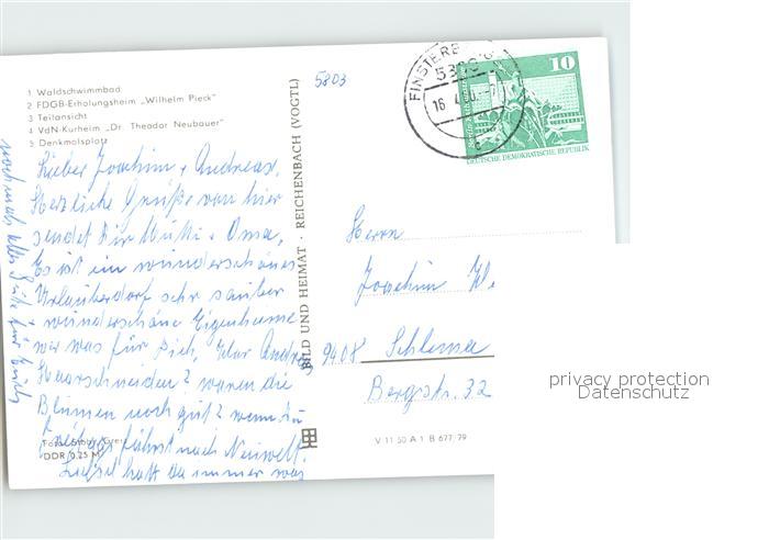 72384198 alte Postkarte Finsterbergen Waldschwimmbad Erholungsheim Wilhelm Pieck Teilansicht Denkmalplatz postalisch gelaufen Erhaltung siehe scans KatCode: 11110016067017
