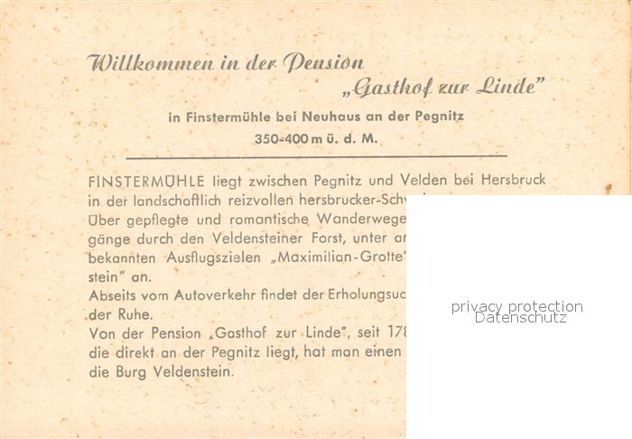 73650863 Finstermuehle Pegnitz Gasthof Pension Zur Linde postalisch nicht gelaufen Werbekarte (keine Postkarte) Erhaltung siehe scans [WerneD78] KatCode: 11110009574140