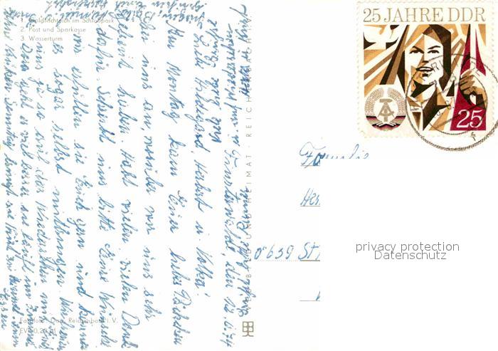 72807562 alte Postkarte Finsterwalde Goldfischteich Schlosspark Post Sparkasse Wasserturm postalisch gelaufen Erhaltung siehe scans [FriedD77] KatCode: 11110012062140