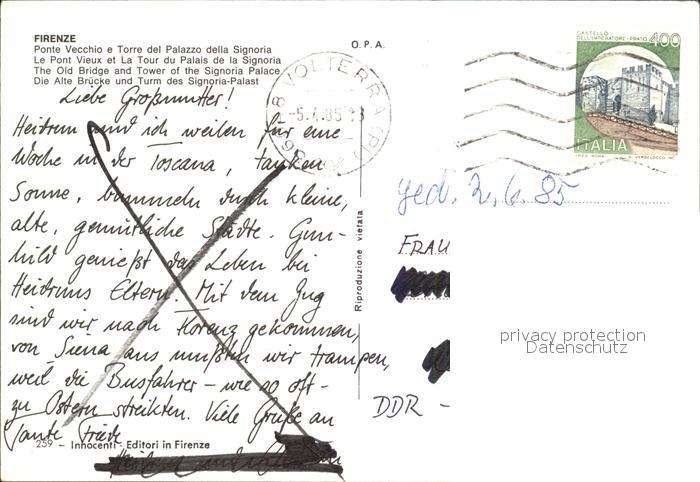 old postcard Firenze Florenz Alte Bruecke Tur4m Signoria-Palast postalisch gelaufen Erhaltung siehe scans