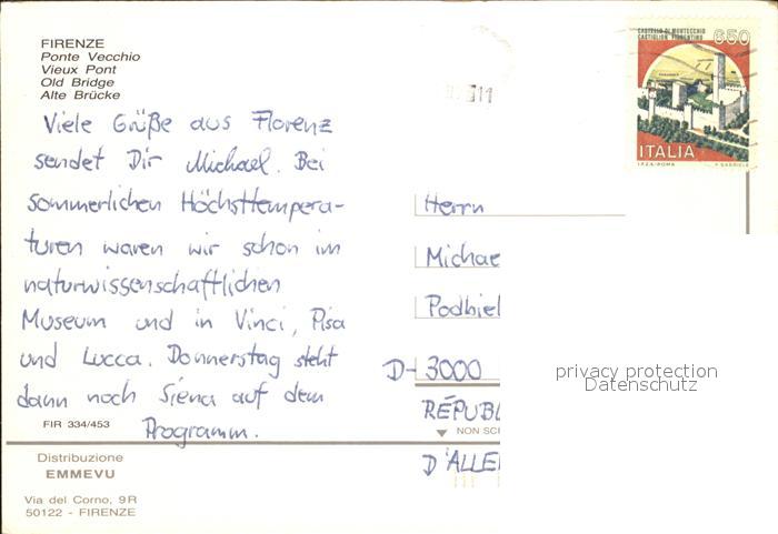 old postcard Firenze Florenz Alte Bruecke postalisch gelaufen Erhaltung siehe scans