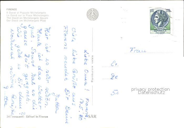 old postcard Firenze Florenz David Michelangelo Platz postalisch gelaufen Erhaltung siehe scans