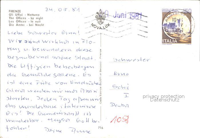 old postcard Firenze Florenz Gli Uffizi notturno aemter bei Nacht postalisch gelaufen Erhaltung siehe scans