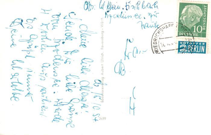 73889162 alte Postkarte Fischbach Friedrichshafen Ansicht mit Kirche Blick ueber den Bodensee gegen Schweizer Alpen postalisch gelaufen Erhaltung siehe scans [FriedD77] KatCode: 11110008435016