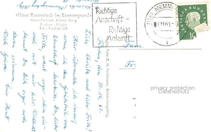 73745602 alte Postkarte Fischen Allgaeu Haus Rosenstock im Sonnengrunde Hotel postalisch gelaufen Erhaltung siehe scans [WerneD78] KatCode: 11110009780121
