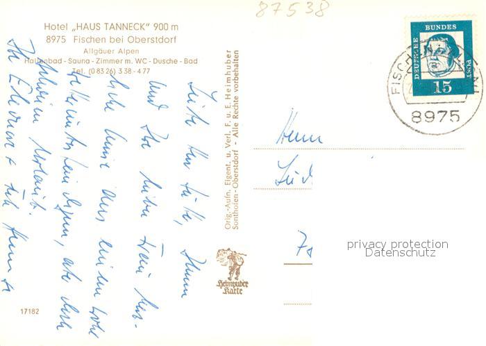 73669293 alte Postkarte Fischen Allgaeu Hotel Haus Tanneck postalisch gelaufen Erhaltung siehe scans [WerneD78] KatCode: 11110009780121