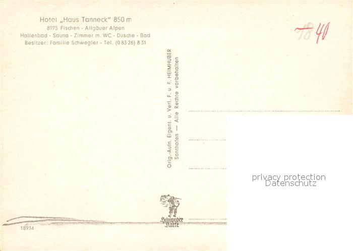 73045359 Fischen Allgaeu Hotel Haus Tanneck Restaurant Hallenbad Halle postalisch nicht gelaufen Erhaltung siehe scans [WerneD78] KatCode: 11110009780121