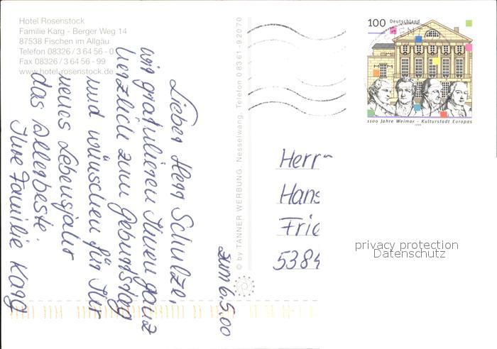 72465694 alte Postkarte Fischen Allgaeu Hotel Rosenstock Gastraum Hallenbad Terrasse postalisch gelaufen Erhaltung siehe scans KatCode: 11110009780121