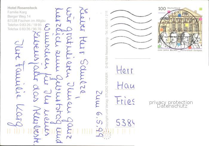 72465693 alte Postkarte Fischen Allgaeu Hotel Rosenstock postalisch gelaufen Erhaltung siehe scans KatCode: 11110009780121