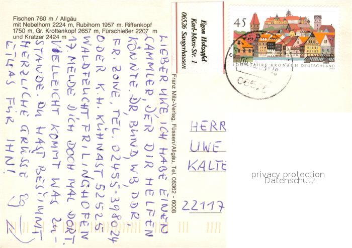 73227727 alte Postkarte Fischen Allgaeu mit Nebelhorn Rubihorn Riffenkopf Krottenkopf Fuerschiesser Kratzer postalisch gelaufen Erhaltung siehe scans [LiesaD40] KatCode: 11110009780121