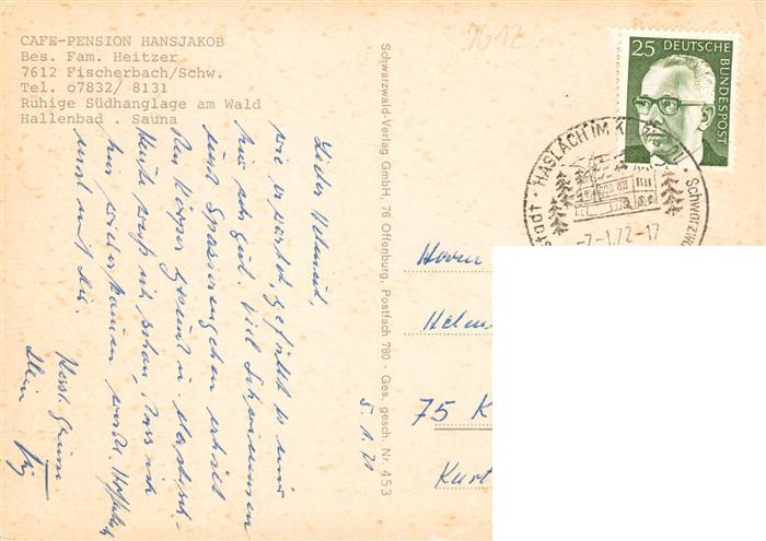 73928718 alte Postkarte Fischerbach Kinzigtal Cafe Pension Hansjakob postalisch gelaufen Erhaltung siehe scans [FriedD77] KatCode: 11110008317029