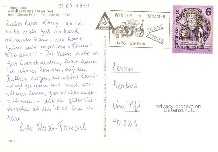 73586983 alte Postkarte Fiss Tirol Alpenheim postalisch gelaufen Erhaltung siehe scans [PaolaD17] KatCode: 11390334070603