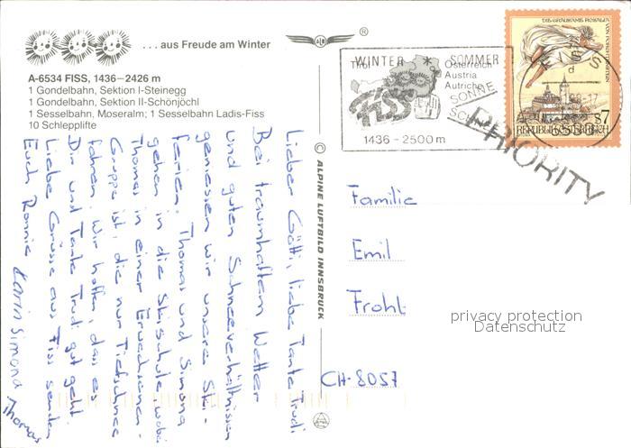 71708972 alte Postkarte Fiss Tirol Dorfpartie Wintersportplatz Skipiste Alpenpanorama postalisch gelaufen Erhaltung siehe scans KatCode: 11390334070603