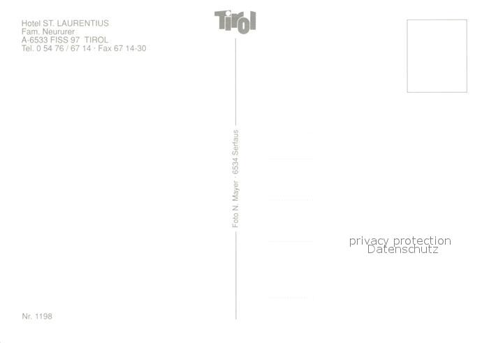 12910271 Fiss Tirol Hotel Sankt Laurentius postalisch nicht gelaufen Erhaltung siehe scans [AndreD76] KatCode: 11390334070603