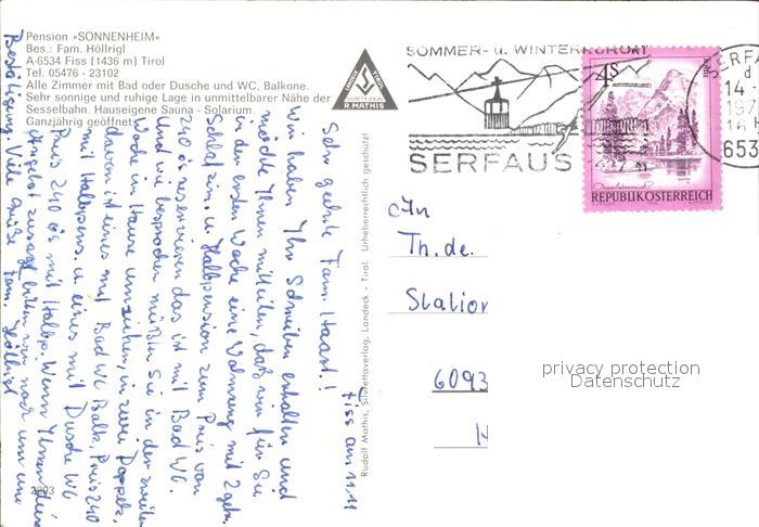 72467230 alte Postkarte Fiss Tirol Pension Sonnenheim postalisch gelaufen Erhaltung siehe scans KatCode: 11390334070603