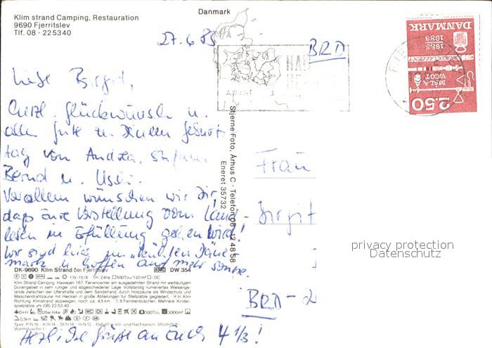 old postcard Fjerritslev Klim strand Camping Restauration Hallenbad Reiten Kinderspielplatz Rettungsring postalisch gelaufen Erhaltung siehe scans