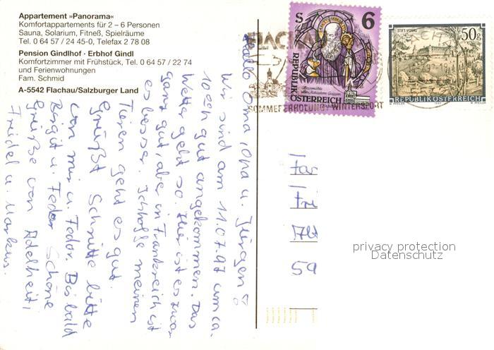 73360656 alte Postkarte Flachau Pension Gindlhof Erbhof Gindl Appartement Panorama Ponyreiten Badesee Alpen postalisch gelaufen Erhaltung siehe scans [FriedD77] KatCode: 11390322050408