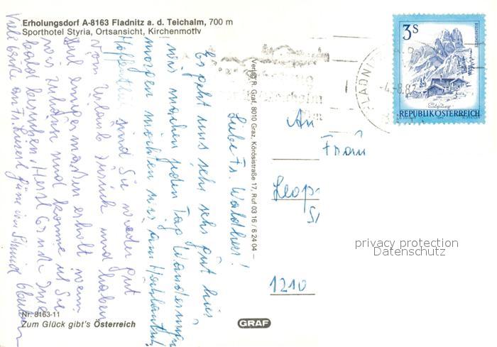 73613055 alte Postkarte Fladnitz Teichalm Panorama Erholungsdorf Motiv mit Kirche Sporthotel Styria postalisch gelaufen Erhaltung siehe scans [FriedD77] KatCode: 11390224061709