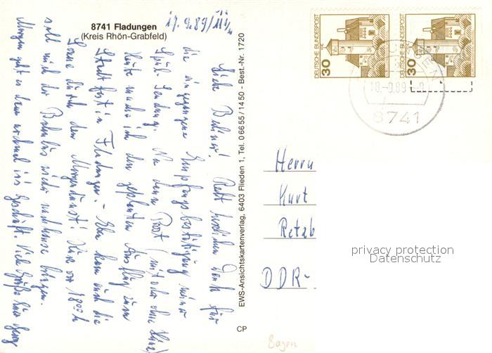 73736714 alte Postkarte Fladungen Brunnen Kirche Marktplatz Fachwerkhaus Stadtmauer Turm postalisch gelaufen Erhaltung siehe scans [FriedD77] KatCode: 11110009673123