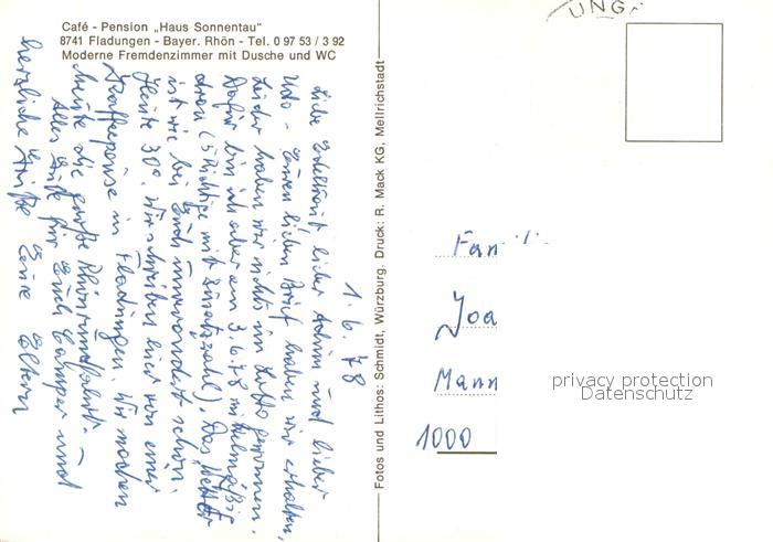 73666846 alte Postkarte Fladungen Cafe Pension Haus Sonnentau Ferienhaeuser Tuerkenbund und Frauenschuh Fixierturm Kirche postalisch gelaufen Erhaltung siehe scans [WerneD78] KatCode: 11110009673123