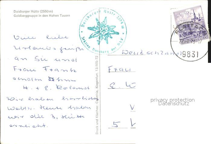 72499583 alte Postkarte Flattach Duisburger Huette Goldberggruppe Hohen Tauern postalisch gelaufen Erhaltung siehe scans KatCode: 11390212020607