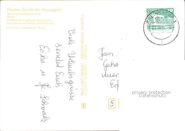 72557422 alte Postkarte Flecken Zechlin Markt FDGB Erholungsheim Eisenhoehe Zechiner See Strandbad postalisch gelaufen Erhaltung siehe scans [KathaD79] KatCode: 11110012068353