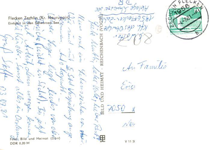 73924138 alte Postkarte Flecken Zechlin Rheinsberg Einfahrt in den Schwarzen See postalisch gelaufen Erhaltung siehe scans [FriedD77] KatCode: 11110012068353