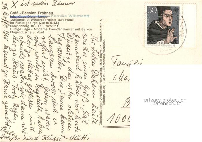 73715961 alte Postkarte Fleckl Cafe Pension Frohnau Gaststube Panorama Freibad postalisch gelaufen Erhaltung siehe scans [WerneD78] KatCode: 11110009472198
