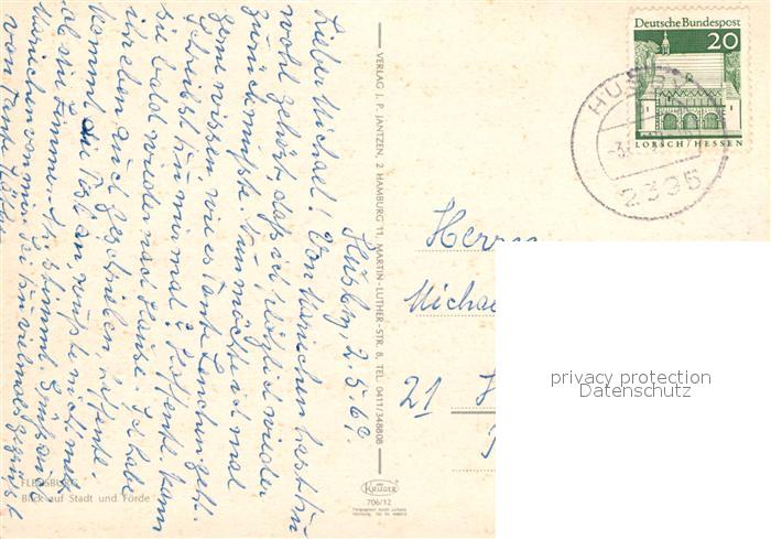 72953502 alte Postkarte Flensburg Blick auf Stadt und Foerde Fliegeraufnahme postalisch gelaufen Erhaltung siehe scans [FriedD77] KatCode: 11110001001000