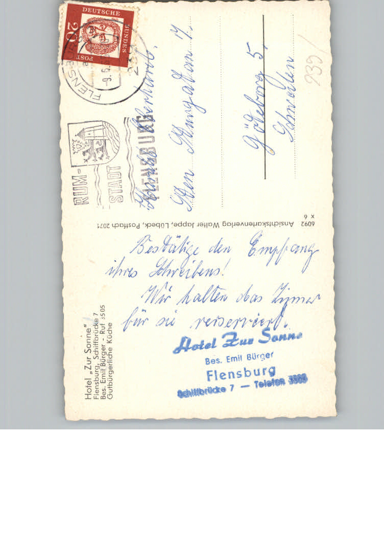 31119957 Flensburg Hotel z. Sonne postalisch nicht gelaufen KatCode: 11110001001000
