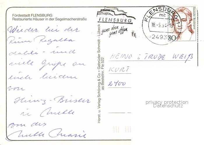72911978 alte Postkarte Flensburg Restaurierte Haeuser Segelmacherstrasse postalisch gelaufen Erhaltung siehe scans [NatalD47] KatCode: 11110001001000