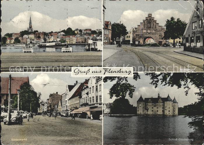 71962078 alte Postkarte Flensburg Schloss Gluecksburg Nordertor Hafen Suedermarkt postalisch gelaufen Erhaltung siehe scans KatCode: 11110001001000