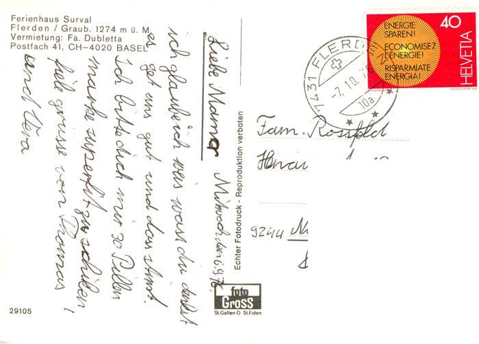 13889418 alte Postkarte Flerden GR Ferienhaus Surval postalisch gelaufen Erhaltung siehe scans [WerneD78] KatCode: 11470100315046