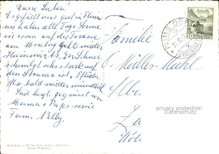 11637674 alte Postkarte Flims Waldhaus Skiwiese postalisch gelaufen Erhaltung siehe scans KatCode: 11470100320122