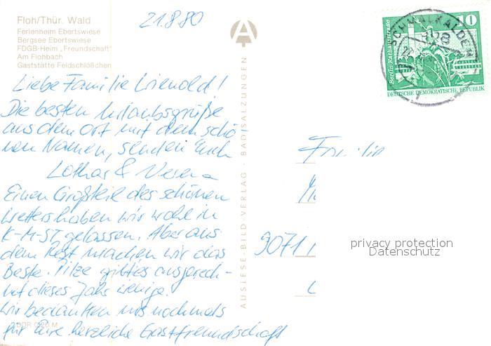 73026547 alte Postkarte Floh-Seligenthal Ferienheim Ebertswiese Bergsee Flohbach Gasthof Feldschloesschen postalisch gelaufen Erhaltung siehe scans [KathaD81] KatCode: 11110016066023