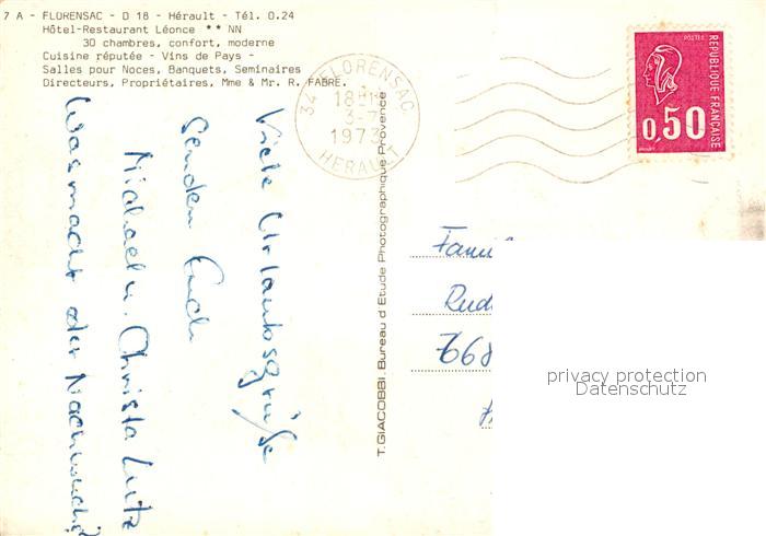 13215557 carte postale Florensac Hotel Restaurant Leonce postalisch gelaufen Erhaltung siehe scans [LiesaD40] KatCode: 11170034134101