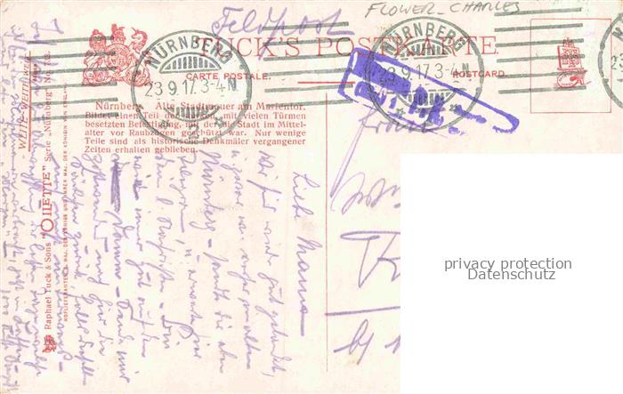 74105006 alte Postkarte FLOWER Charles E. TUCKS-OILETTE UK Nr. 733 Nuernberg Alte Stadtmauer Marientor postalisch gelaufen Erhaltung siehe scans [IrynaD87] KatCode: 22240000001600