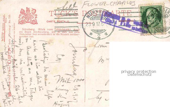74105007 alte Postkarte FLOWER Charles E. TUCKS-OILETTE UK Nr. 733 Nuernberg Blick vom Troedelmarkt postalisch gelaufen Erhaltung siehe scans [IrynaD87] KatCode: 22240000001600