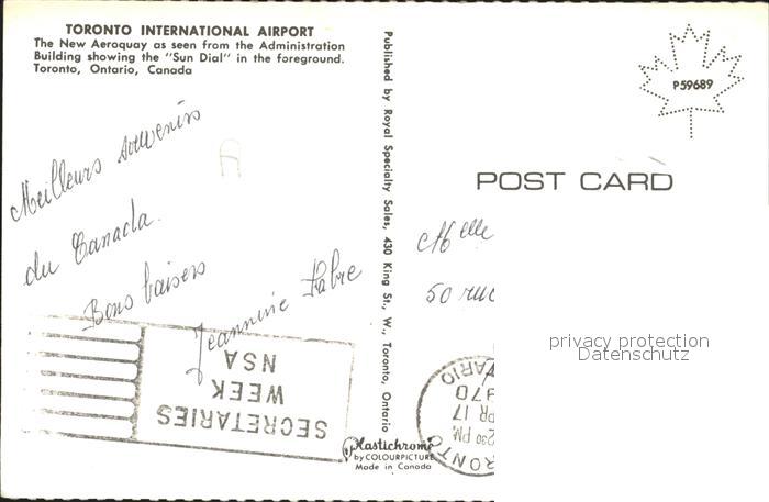 alte Postkarte Flughafen Airport Aeroporto Toronto New Aeroquay Sun Dial postalisch gelaufen Erhaltung siehe scans