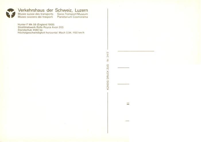 73936448 Flugzeuge Militaria Verkehrshaus der Schweiz Luzern Hunter F Mk 58 Rolls-Royce Avon 203 postalisch nicht gelaufen Erhaltung siehe scans [IrynaD87] KatCode: 22120000000400